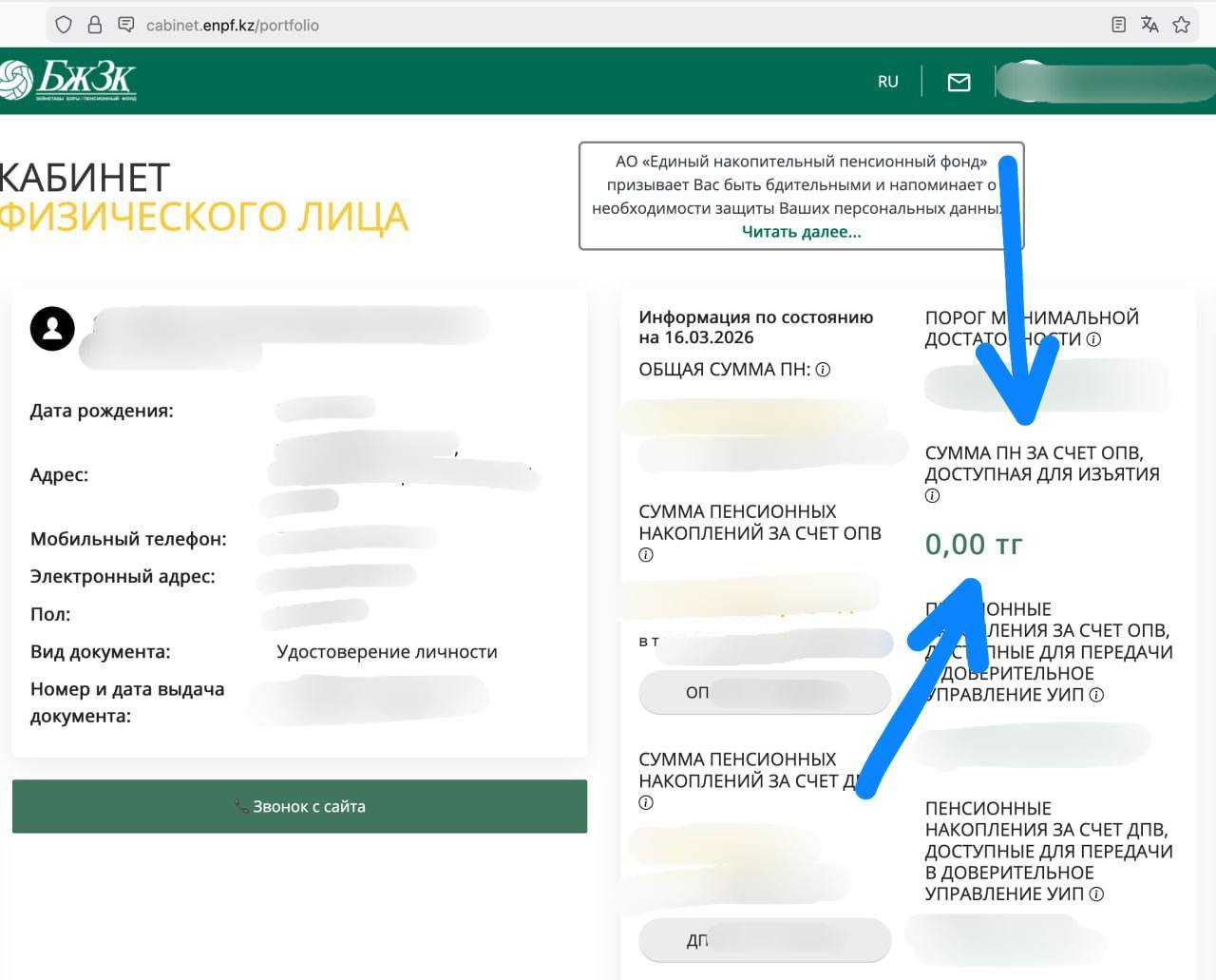 2) Смотрите пункт «Сумма ПН за счет ОПВ, доступная для изъятия». Это деньги, которые вы можете направить на погашение ипотеки. Вот так выглядит это на сайте ЕНПФ: