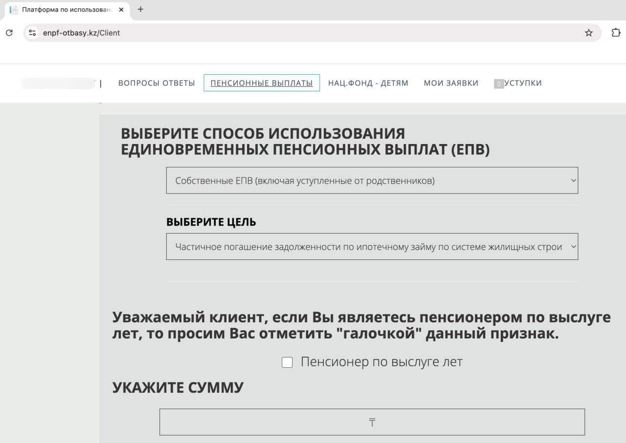 4) За 2 недели до даты платежа зайдите на платформу enpf-otbasy.kz с помощью ЭЦП и запросите сумму, которая чуть больше вашего основного долга в ежемесячном платеже. К примеру, если основной долг 100 000₸, можно указать 101 000₸. В качестве цели укажите: «Частичное погашение задолженности по ипотечному займу по системе жилищных строительных сбережений».