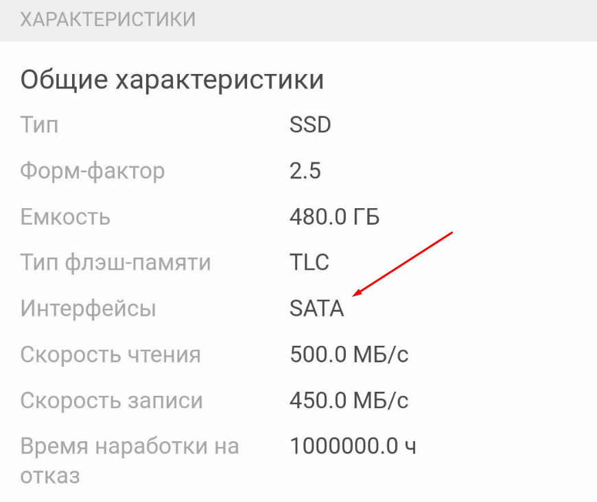 Идем далее. После того, как вы выбрали SSD, проверьте еще раз в характеристиках, чтобы у него был именно нужный вам тип подключения.