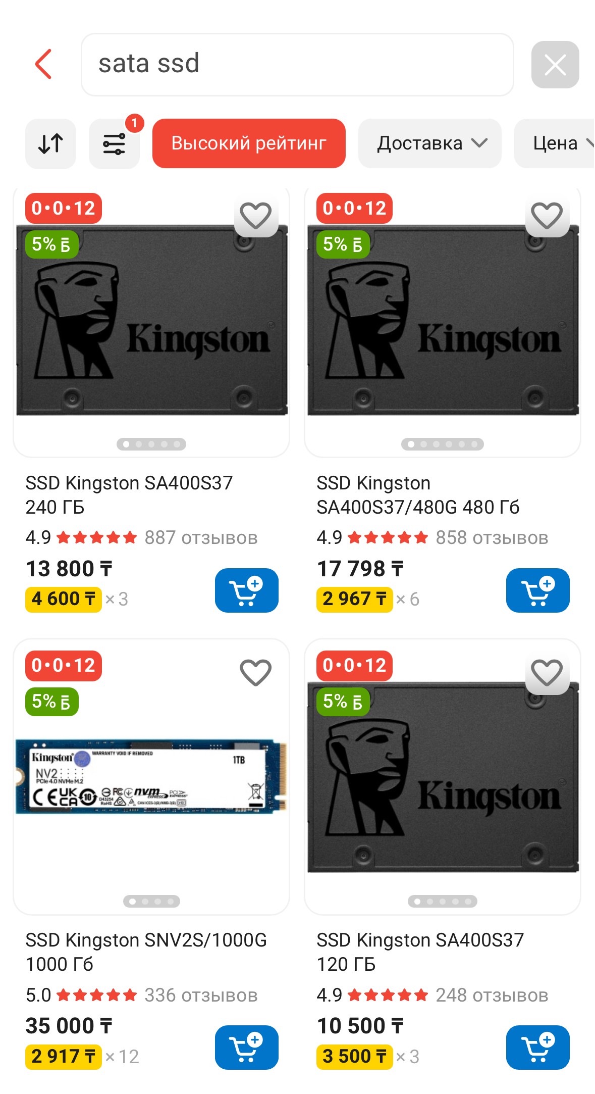 Свой SSD-диск мы покупали через Kaspi-магазин в Alser. Для этого зашли в Kaspi-магазин, в строке поиска вписали "SATA SSD" и затем выбрали фильтр "Высокий рейтинг" (точно также можете вписать "M2 SSD", если вам нужен он).