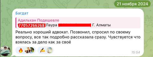 К слову, я помнил про этот пост, но я не рассматривал даже такой вариант, потому что мы в Астане, а Лаура в Алматы. После публикации поста 27 ноября подписчики делились контактами хороших автоюристов. Я начал им звонить и оказалось, что один из номеров и оказался Лауры (я не знал, что звоню по тому же номеру, что оставлял в канале несколько лет назад).
