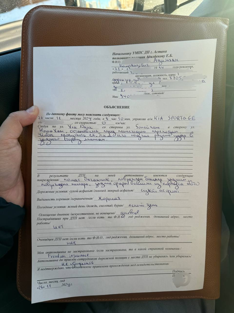 В объяснительной указываете ФИО, дату и время ДТП, адрес проживания, должность, номер телефона, ИИН. Описываете модель авто, номер, скорость. Если стояли, то пишете в строке скорость 0 км/ч. Пишете, что произошло, что повреждено, каким был асфальт, видимость и т.д.