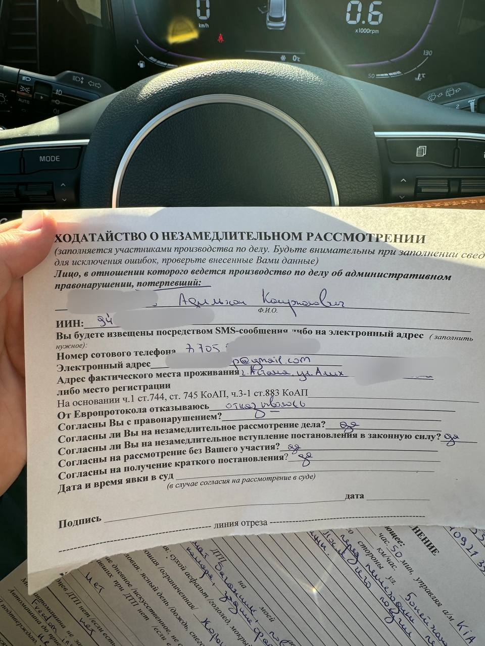 Пока они будут делать схему и протокол ДТП, вам дадут бланки для заполнения: ходатайство о незамедлительном рассмотрении и объяснительную.