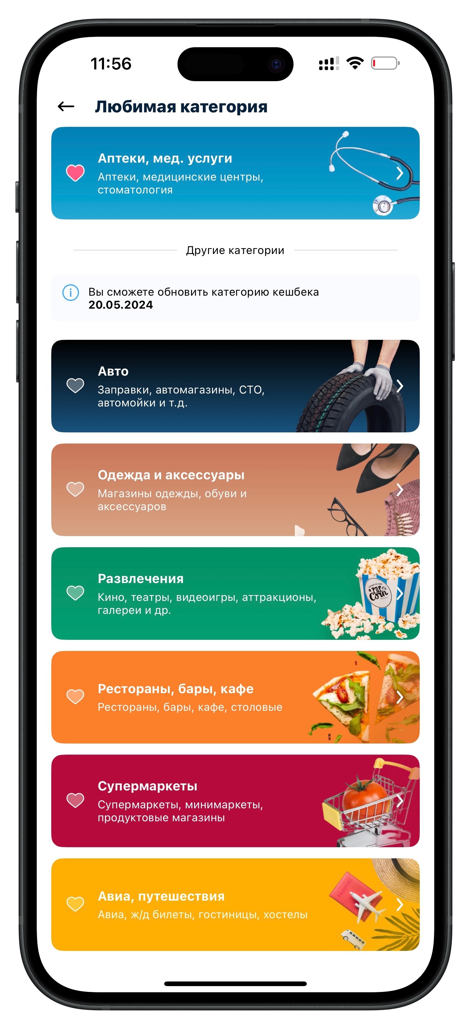 Ещё для автокарты дополнительно можно выбрать любимую категорию «Авто» (1%), которая суммируется с категорией «Авто» по умолчанию. Например, если вы оплачиваете в автосалоне или на АЗС со смартфона, то будете получать с каждой оплаты до 11% бонусов (до 5% при выполненных условиях + 5% +1% за выбранную категорию Авто).